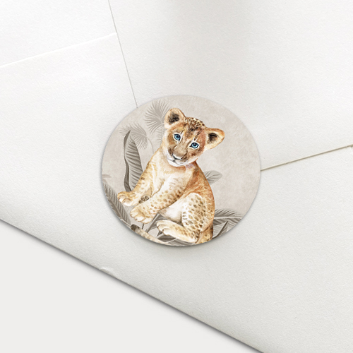 Schattige sluitzegel van een leeuwenwelpje in de jungle. Deze sluitzegel is perfect voor een unisex geboortekaartje.