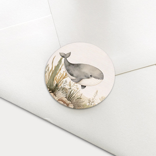Sluitzegel voor geboortekaartje met onderwaterwereld thema en walvis.
