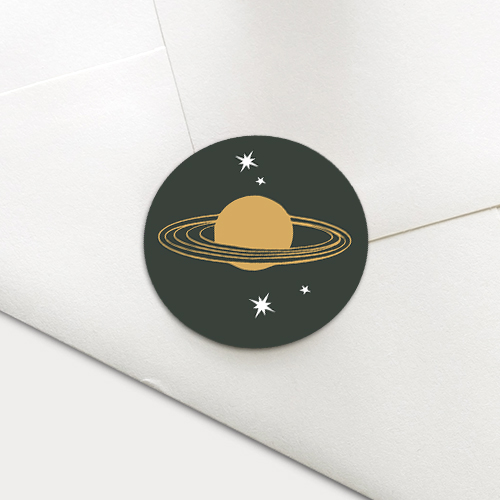 Een stoere astrologische sluitzegel met een planeet en sterretjes om de envelop van je geboortekaartje mee dicht te maken.