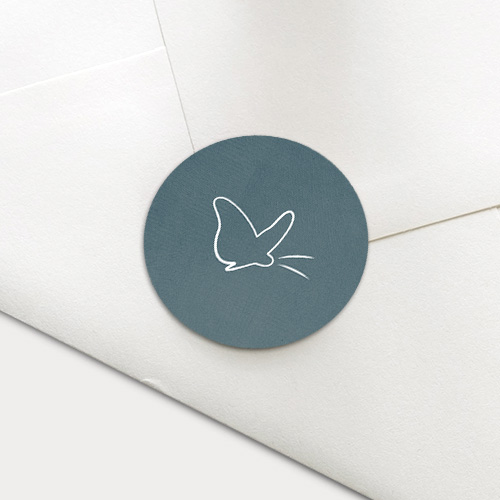 Blauwe sluitzegel met een vlinder. Deze sluitsticker is te gebruiken voor de envelop van het geboortekaartje.