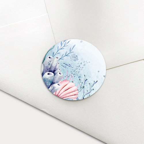 Oceaan sluitsticker voor de envelop van het geboortekaartje van je zoon of dochter. Deze sluitzegel heeft een design van een onderwaterwereld met koraal en schelp.