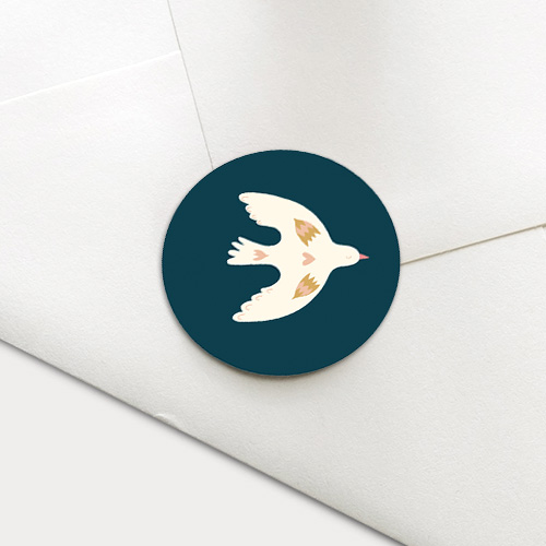 Een donkerblauwe sluitzegel met een vredesduif voor een geboortekaartje.