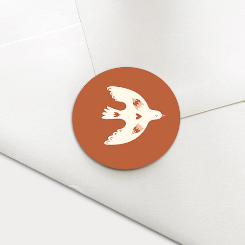 Een roestkleur sluitzegel met een sierlijke vredesduif voor een geboortekaartje.