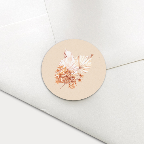 Maak de verzending van de trouwkaart helemaal af met deze prachtige bloemen sluitsticker. Op deze sluitzegel een beige achtergrond met droogbloemen.