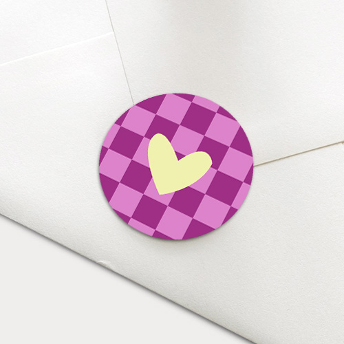 Maak jullie trouwkaart helemaal af met deze trendy sluitzegel. Op deze sluitzegel een blokjespatroon achtergrond in roze en paarse kleurtinten met een geel hartje.