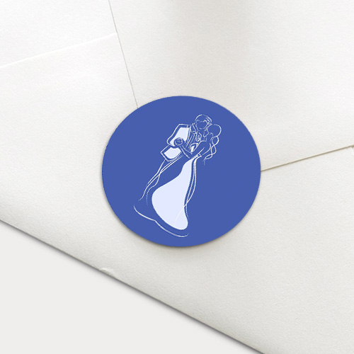 Ronde sticker met blauwe achtergrond en witte lijntekening van een dansend bruidspaar. De sticker is te gebruiken als sluitsticker voor de envelop van je trouwkaart of voor op bijvoorbeeld de trouwbedankjes.| Totaalprijs: 0 |