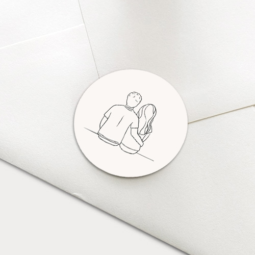 Ronde sluitsticker met een lijntekening van een koppel. De sticker is te gebruiken als sluitsticker voor de envelop van je trouwkaart of voor op bijvoorbeeld de trouwbedankjes.