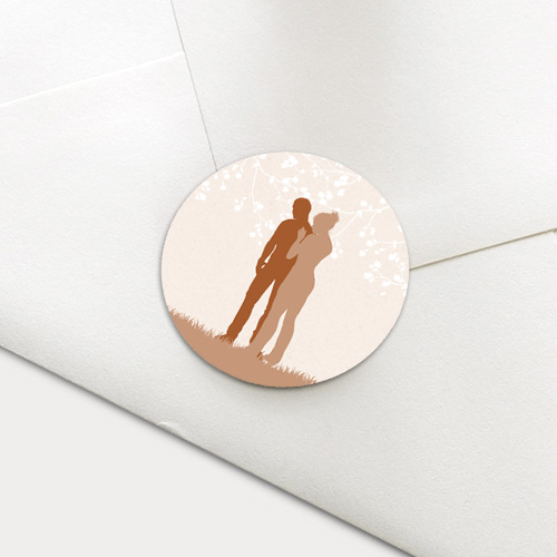 Maak de uitnodiging voor jullie bruiloft helemaal af met deze prachtige sluitzegel. Op deze sluitzegel zie je een mooi silhouet van het bruidspaar staan in beige- en bruintinten.