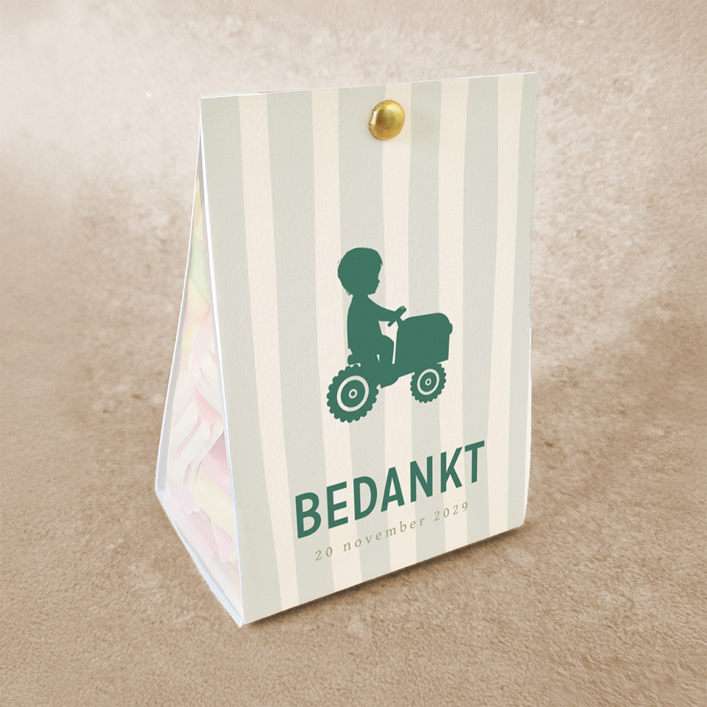 Op zoek naar een geboortebedankje? Ga voor dit doopsuiker tentkaartje met boorgaatje. Dit tentkaartje Floris heeft een stoer design in groene kleuren. Je ziet een silhouet van een jongentje op een tractor, omringd door boerderijdieren. De achtergrond heeft een strepen patroon. Voeg zelf een zakje met bijvoorbeeld snoepjes toe. Met een splitpen kun je het tentkaartje vastmaken. De splitpen wordt niet standaard meegeleverd maar kan hier worden besteld.