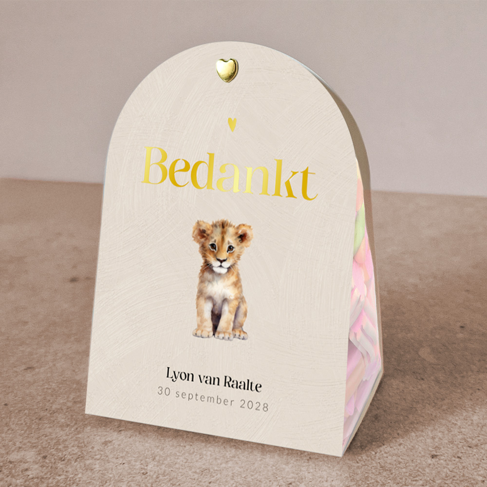 Op zoek naar een geboortebedankje? Ga voor dit mooie doopsuiker snoepzakje. Op dit doopsuiker tentkaartje Lyon zie je een schattig leeuwen welpje met de tekst bedankt. De achtergrond heeft mooie gouden vegen en de tekst wordt gedrukt in glanzende goudfolie. Voeg zelf een zakje met bijvoorbeeld snoepjes toe. Met een splitpen kun je het tentkaartje vastmaken. De splitpen wordt niet standaard meegeleverd maar kan hier worden besteld.