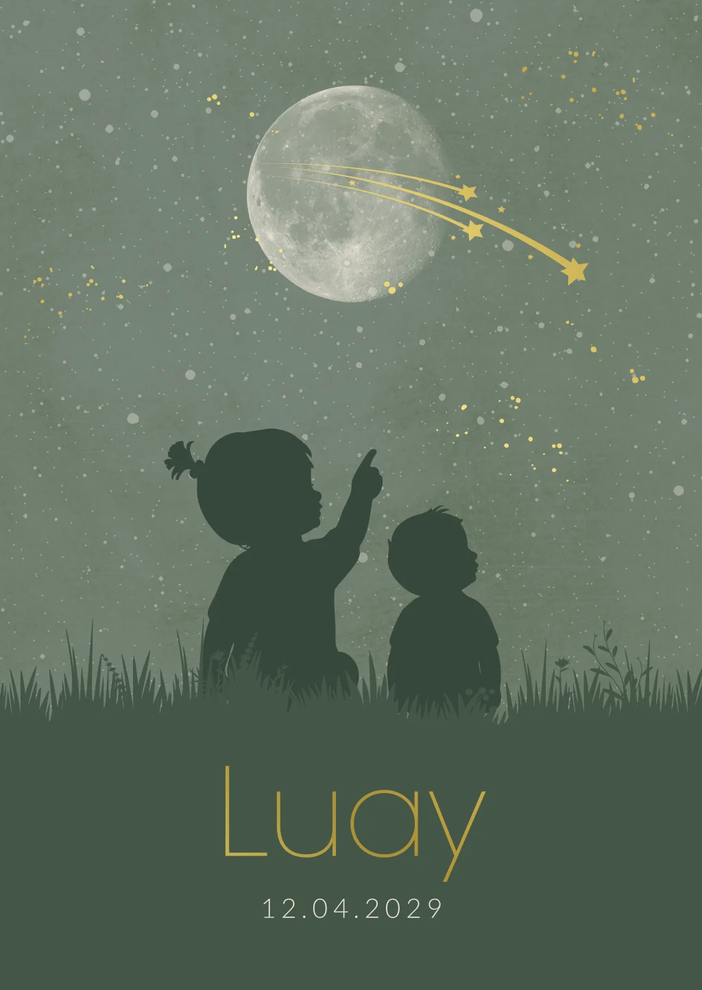 Op zoek naar een uniek en origineel geboortekaartje voor een jongen die zeker zal opvallen? Ga dan voor een tentkaartje mét goudfolie. Dit kaartje zet je eenvoudig in elkaar en blijft op zichzelf staan. Dit luxe geboortekaartje is ontworpen voor een tweede kindje, een broertje. Je ziet een silhouet van een grote zus met haar grote broertje. Ze zitten in het gras en kijken naar een vallende ster voor de maan. De goudfolie geeft een luxe afwerking aan dit al bijzondere geboortekaartje Luay.