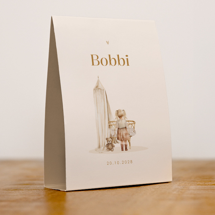 Een mooi geboorte tentkaartje voor een jongen of een meisje in beige kleurtinten. Op dit geboortekaartje Bobbi zie je een meisje (grote zus) bij de wieg staan. Naast de wieg staat een teddybeertje. Boven de naam van het kindje zie je een subtiel hartje. Dit geboortekaartje heeft een retro vintage look.