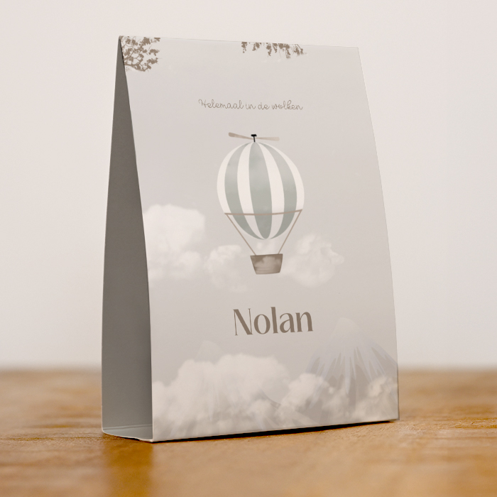 Een avontuurlijk tentkaart geboortekaartje voor de komst van jullie zoon. Op het geboortekaartje Nolan zie je hoog in de wolken een luchtballon zweven boven de bergen. Het gehele geboortekaartje is in een grijstint vormgegeven en je ziet een subtiele grijsblauwe kleur in de luchtballon terugkomen. Het gehele tentkaart geboortekaartje Nolan is naar eigen wens aan te passen via de online editor.