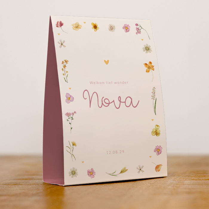 Een mooi geboorte tentkaartje voor een meisje. Op dit geboortekaartje Nova staat een prachtig kleurrijk bloemenkader met hartjes. Een vrolijk en origineel geboortekaartje voor een meisje.