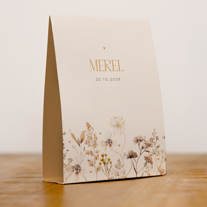Geef je dochter een uniek geboortekaartje met dit prachtige geboorte tentkaartje Merel. Dit geboorte tentkaartje is een bijzondere manier om de komst van jullie meisje te delen met vrienden en familie. Het tentkaartje is bedrukt met veldbloemen en hartjes tussen de bloemen door. De beigetinten geven het tentkaartje een charmante uitstraling. Pas dit geboortekaartje Merel geheel naar eigen wens aan in de online editor.
