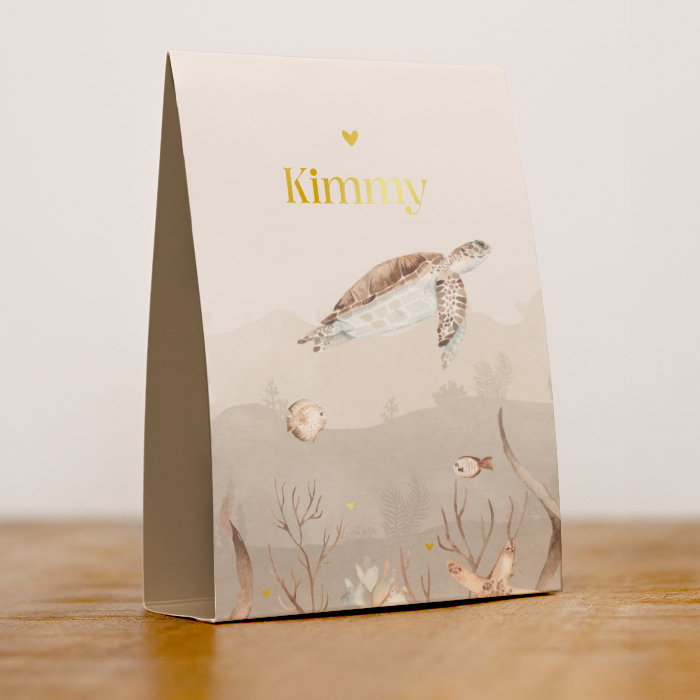 Een unisex tentkaart geboortekaartje voor de geboorte van jullie zoon of dochter. Op het geboortekaartje zie je een schildpad en twee vissen zwemmen in de onderwaterwereld. Je ziet dat de bodem in neutrale ton sur ton tinten is vormgegeven met allerlei waterplanten. Op de voorgrond zie je een aantal waterplanten met een zeester. De neutrale kleuren maken dit kaartje unisex waardoor deze geschikt is voor zowel een jongen als een meisje. De naam van jullie kindje is standaard in foliedruk goud vormgegeven. Foliedruk geeft een extra luxe uitstraling aan het geboortekaartje. Pas dit geboortekaartje Kimmy geheel naar eigen wens aan in de editor.