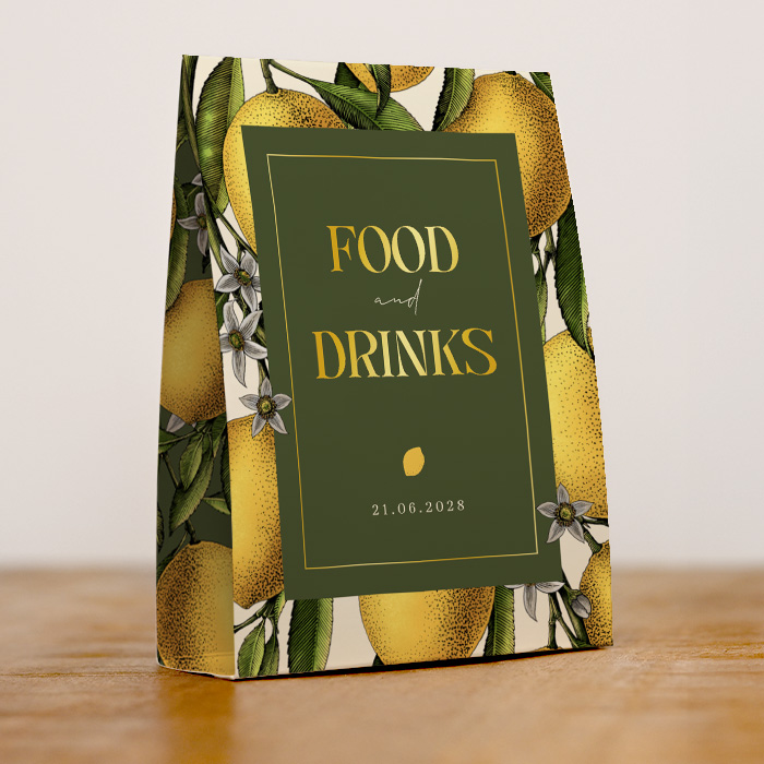 Een menukaart in de vorm van tentkaart is een unieke manier om je bruiloftsdiner zichtbaar te maken. Op de voorzijde van deze tafelkaart een vintage tekening van citroenen met een gouden kader. De tekst en initialen worden daarnaast ook gedrukt in goudfolie. Deze menukaart voor een bruiloft heeft een stijlvol design en zal zeker in de smaak vallen bij je gasten. Pas de teksten, lettertypes en kleuren eenvoudig aan in de editor.