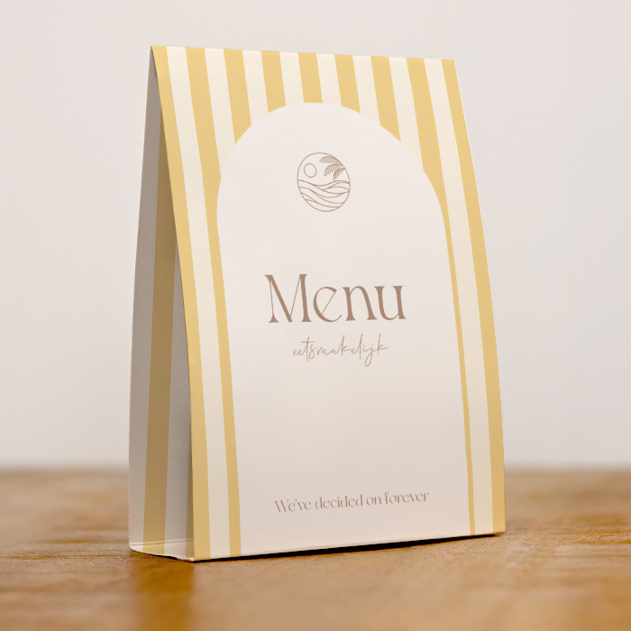 Een menukaart in de vorm van een tentkaart is een unieke manier om je bruiloftsdiner zichtbaar te maken. Op de voorzijde staan gele strepen met een beige kader met zomers strand icoon. Deze menukaart voor een bruiloft heeft een vrolijk design en zal zeker in de smaak vallen bij je gasten. Pas de teksten, lettertypes en kleuren eenvoudig aan in de editor.