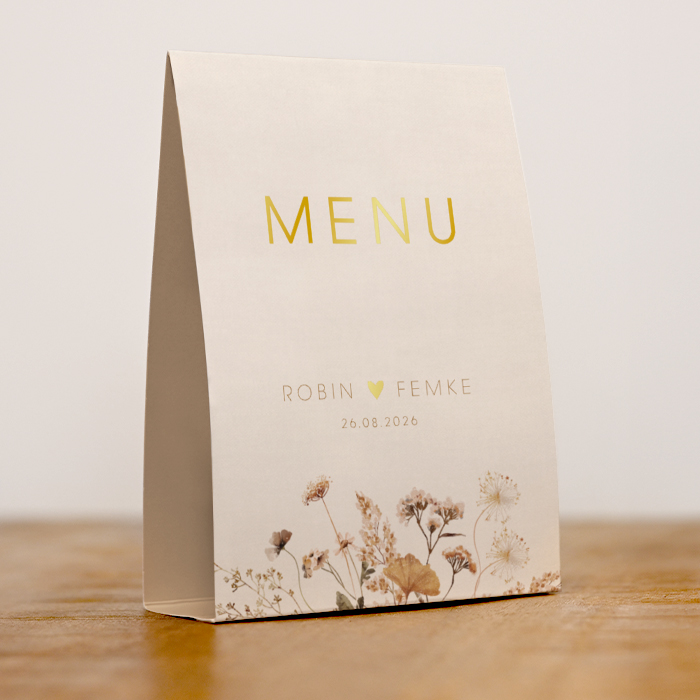 Tentkaart menukaart met veldbloemen en goudfolie