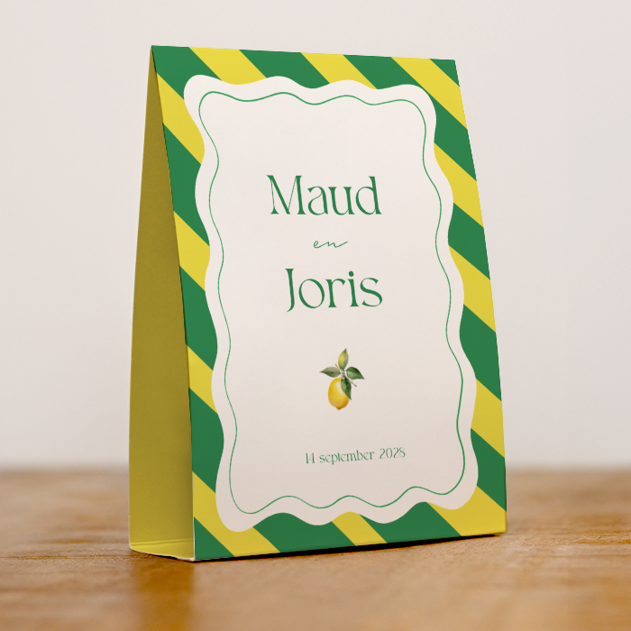 Een kleurrijke unieke tentkaart trouwkaart. Deze trouwkaart valt op qua kleuren en patronen. Je ziet een groen gele gestreepte achtergrond met een golvend kader waarin de naam en de trouwdatum van het bruidspaar staat. De trouwkaart krijgt door het citroentje een mediterraans tintje. Laat jullie gasten versteld staan door deze kleurrijke kaart. De gehele trouwkaart is naar eigen smaak in de online editor aan te passen.