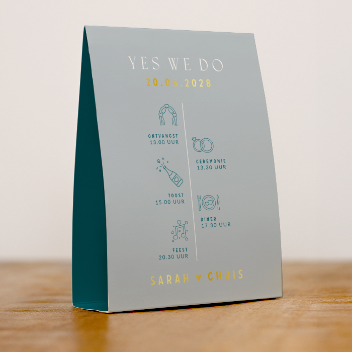 Deze tentkaart trouwkaart met prachtige goud foliedruk en een tijdlijn is een mooie keuze voor stellen die op zoek zijn naar een bijzondere trouwkaart. Foliedruk geeft de tentkaart een extra luxe uitstraling. De tentkaart is blauw van kleur en heeft allerlei symbolen en tijden op de tijdlijn staan. Deze trouwkaart kun je naar eigen wens aanpassen in de online editor. Maak jullie trouwkaart persoonlijk door jullie eigen tijdlijn toe te voegen. Maak de tentkaart af met een bijpassende envelop en sluitzegel.