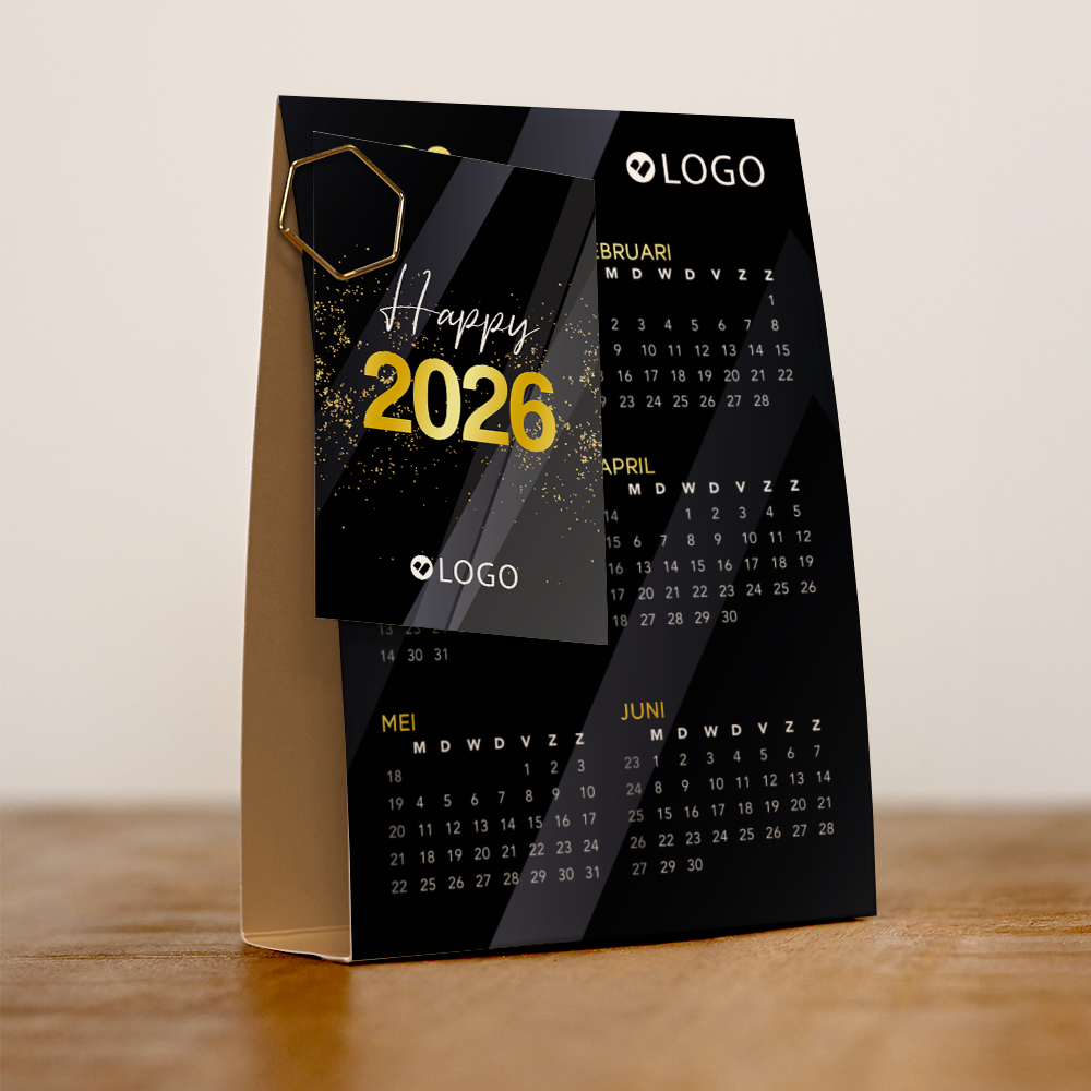 Mini bureaukalender met basic zwart design. De maanden en het jaartal worden gedrukt in goudfolie, dat geeft een luxe uitstraling aan deze tentkaart kalender. Bevestig een klein kaartje aan de kalender met een paperclip. Gebruik het kleine kaartje bijvoorbeeld als kerstkaart, bedankkaart of uitnodiging.