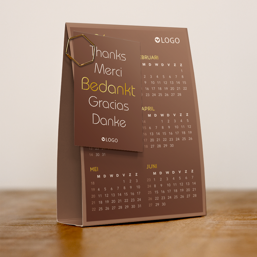 Mini bureaukalender met basic design. De maanden en het jaartal worden gedrukt in écht goudfolie. Extra leuk om deze tentkaart te geven aan je medewerkers en zakelijke relaties met een klein kaartje eraan bevestigd. Gebruik het kleine kaartje bijvoorbeeld als kerstkaart, bedankkaart of uitnodiging.