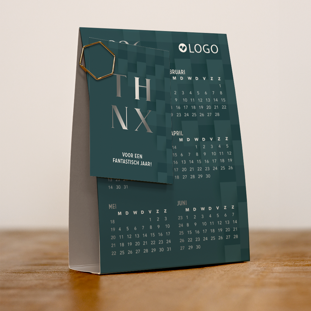 Een bureaukalender met een strak design! De maanden en het jaartal worden gedrukt in zilverfolie, dat geeft een luxe uitstraling aan deze tentkaart kalender. Bevestig een klein kaartje aan de kalender met een paperclip. Gebruik het kleine kaartje bijvoorbeeld als kerstkaart, bedankkaart of uitnodiging.