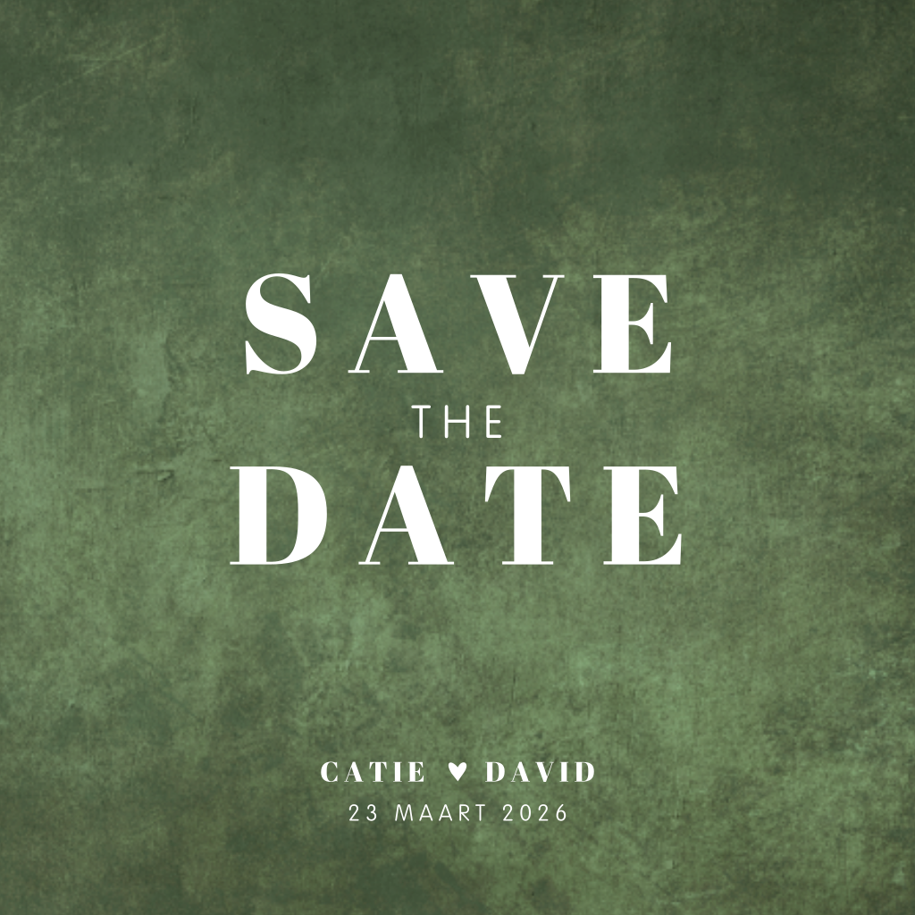 Een basic Save the Date kaart met afgeronde hoeken en een trendy, groene velvetlook achtergrond. Op dit Save the Date kaartje worden teksten gedrukt in écht goudfolie. Dit kaartje is rustig, maar door de toevoeging van foliedruk krijgt het kaartje een extra luxe uitstraling. Pas dit kaartje naar eigen smaak aan in de editor. Ook mogelijk met roséfolie, koperfolie, zilverfolie of zwartfolie. Hulp nodig? Laat het ons gerust weten.