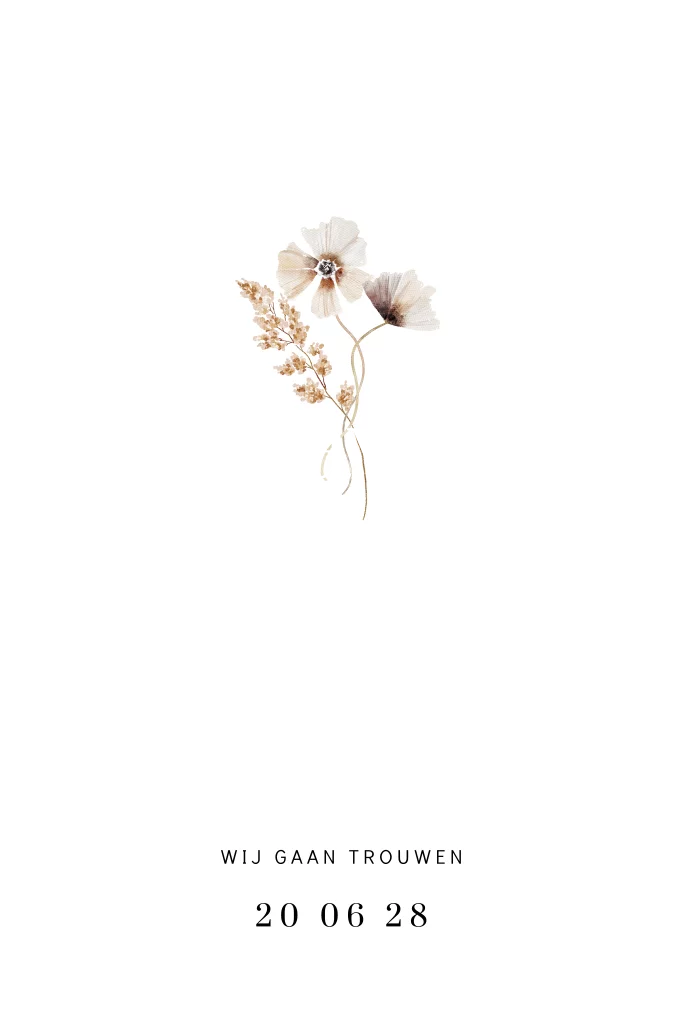 Kondig jullie huwelijksdatum op een stijlvolle en unieke manier aan met deze Save the Date kaart. Deze prachtige kaart met veldbloemen en foliedruk straalt eenvoud en elegantie uit. Pas de kaart naar je eigen smaak aan in de editor en combineer met een mooie envelop en sluitzegel om het helemaal af te maken.