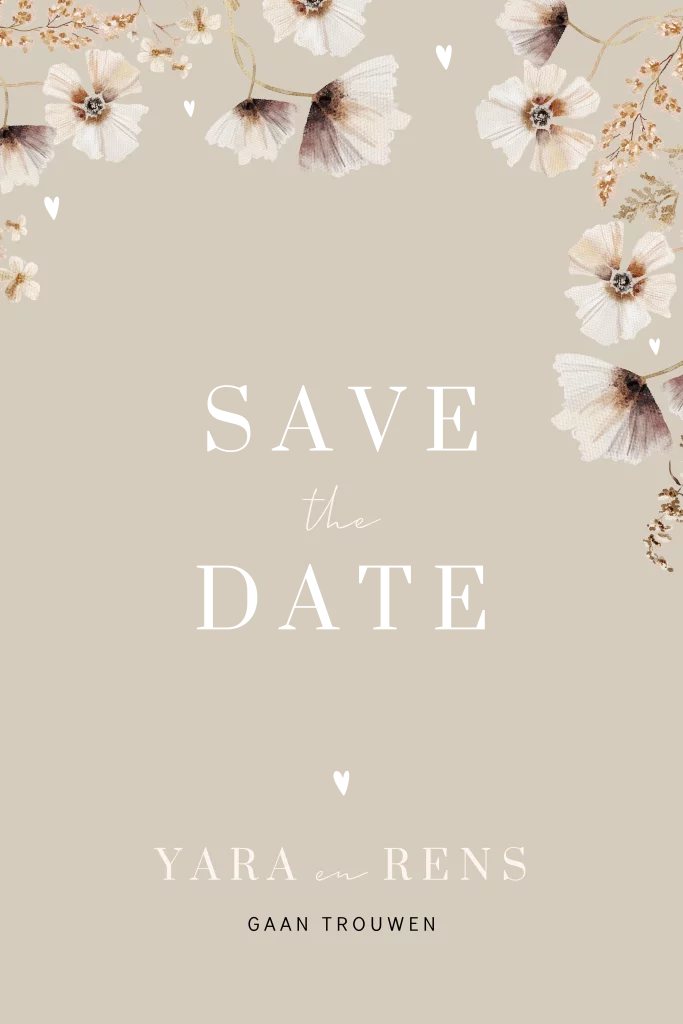 Sierlijke Save the Date kaart met prachtige aquarel veldbloemen en hartjes voor een beige bruine achtergrond. De goudfolie geeft deze kaart een luxe en stijlvolle uitstraling. Pas deze Save the Date kaart naar je eigen smaak aan in de editor en combineer met een mooie envelop en sluitzegel om het helemaal af te maken.