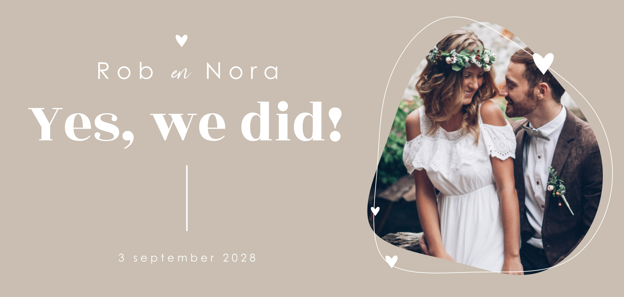 Stijlvolle just married kaart om te laten weten dat jullie zijn getrouwd met een foto van jullie als pasgetrouwd stel in een organische vorm. Deze kaart heeft een licht bruine achtergrond en is afgewerkt met goudfolie en ronde hoeken. Pas de kaart naar eigen wensen aan in de editor. Hulp nodig? We staan voor je klaar!