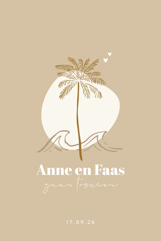 Rustige trouwkaart met ronde hoeken en goudfolie. Deze huwelijksuitnodiging heeft het thema strand door de warme beige bruine achtergrond met organische vorm, palmboom en golven. Perfect voor een strandbruiloft! Jullie namen en de hartjes worden gedrukt in écht goudfolie, helemaal passend bij de warme vibe van deze prachtige trouwkaart. Je kunt deze huwelijksuitnodiging zelf bewerken in de editor en naar je eigen wensen aanpassen, zodat het helemaal jullie eigen, unieke kaart wordt!