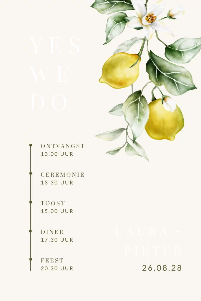 Prachtige trouwkaart met een citrus aquarel ontwerp, tijdlijn en luxe foliedruk. Deze unieke uitnodiging is perfect voor een stijlvolle en klassieke bruiloft met een mediterraans thema. De combinatie van de frisse citroen aquarel met takjes en de glanzende foliedruk zorgt voor een elegant en tijdloos ontwerp. De bijpassende donkergroene envelop en sluitzegel maakt het geheel compleet en geeft de uitnodiging een luxe uitstraling. Bestel deze trouwkaart en maak een onvergetelijke indruk op jullie genodigden.