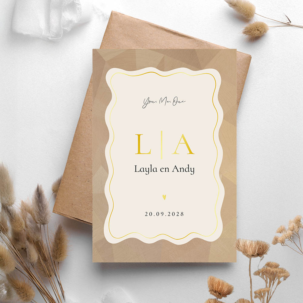 Met een prachtig geometrisch goudlook patroon gecombineerd met organische vormen en foliedruk straalt deze exclusieve kaart elegantie uit en voegt het een origineel tintje toe aan elke bruiloft. Bestel vandaag nog deze trouwkaart met initialen, folie en geometrisch patroon in goudlook en maak jullie speciale aankondiging compleet. Combineer met een mooie envelop en sluitzegel om het helemaal af te maken.