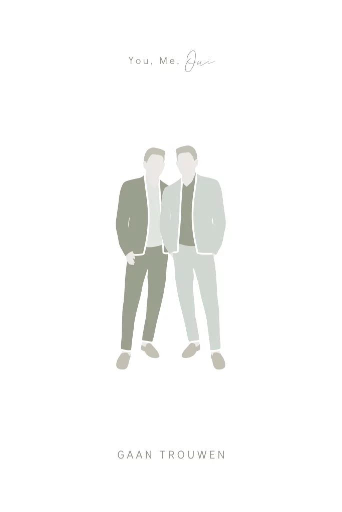 Cleane trouwkaart voor een gay huwelijk met een silhouet van 2 mannen. De namen van de bruidegoms staan in een sierlijk lettertype en worden gedrukt in écht goudfolie. Deze trouwkaart is overwegend wit met silhouetten van beide mannen in mooie trendy groene kleuren. De ronde hoeken maken deze unieke trouwkaart helemaal af. Pas deze huwelijksuitnodiging naar je eigen smaak aan in de editor en combineer met een mooie envelop om het helemaal af te maken.