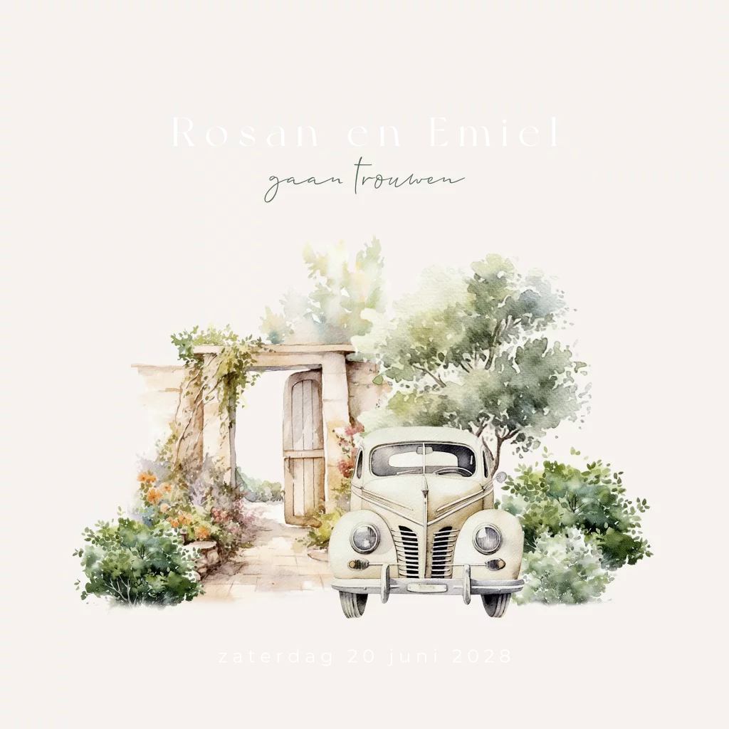 Romantische auto trouwkaart met een aquarel landschap in het buitenland met een oldtimer trouwauto. Dit is een prachtige luxe trouwkaart met goudfolie en is geschilderd in mediterraanse stijl. Perfect voor een bruiloft met mediterraans thema of een bruiloft in het buitenland. Pas de kaart geheel naar eigen wens aan in de editor, zodat jullie trouwkaart precies aan jullie wensen voldoet. Heb je vragen? Laat het ons dan gerust weten, we helpen je graag verder!