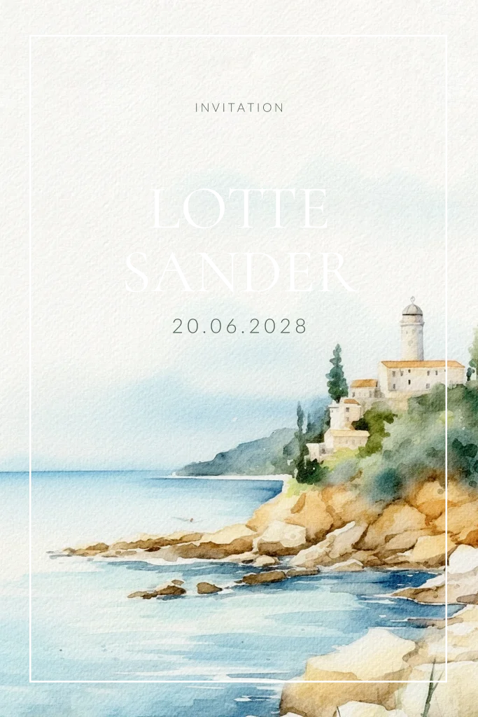 Rijk beschilderde trouwkaart met een landschap van het Italiaanse Comomeer met op de achtergrond in de bergen een Italiaans dorpje met kerk en cipressen. De aquarel schildering is omringd met een kader in goudfolie, wat samen met de namen van het bruidspaar in goudfolie, een luxe uitstraling geeft aan deze huwelijksuitnodiging. Perfect voor een stel die een mediterraans thema heeft voor hun bruiloft of gaat trouwen in Italië.