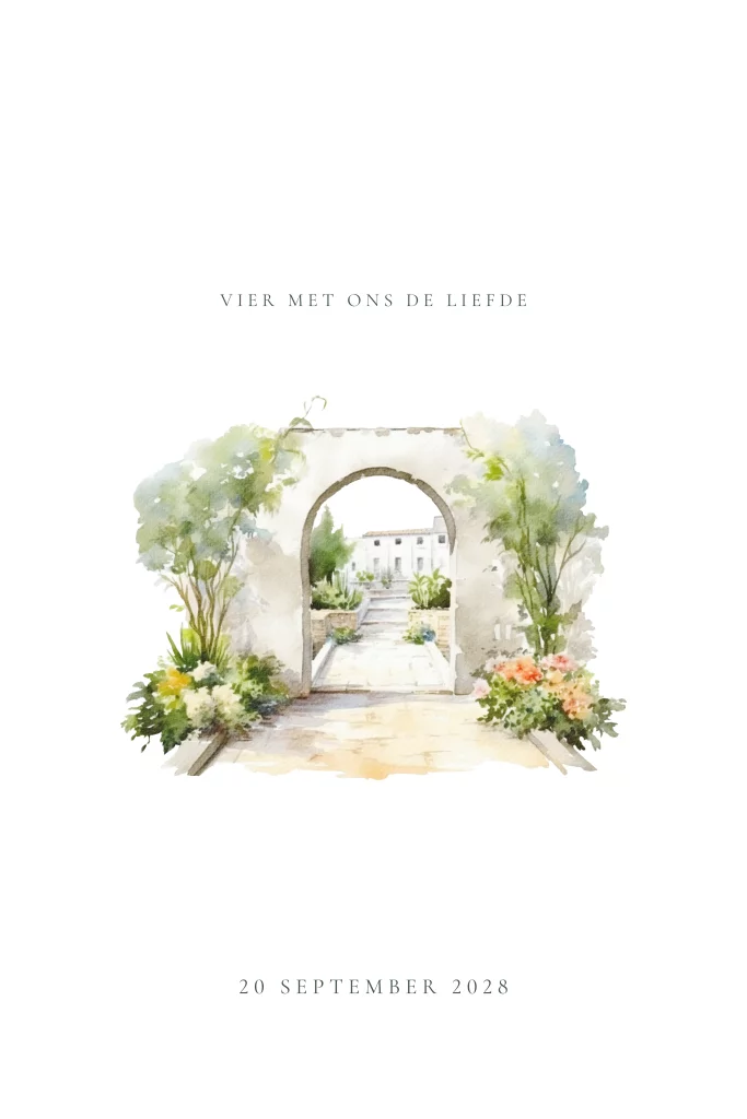 Deze unieke trouwkaart is een ware blikvanger met zijn prachtige foliedruk en aquarel landschap van het rustige Italiaanse landschap. Perfect voor een mediterraanse bruiloft of bruiloft in het buitenland, zoals in Italië. Door een poort zie je de ingang van een mediterraans huis met bomen en bloemen. De toevoeging van echt goudfolie geeft de uitnodiging een luxe uitstraling.