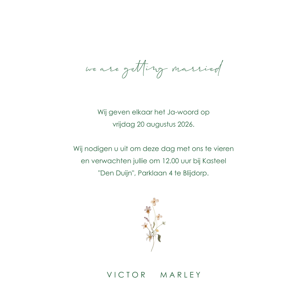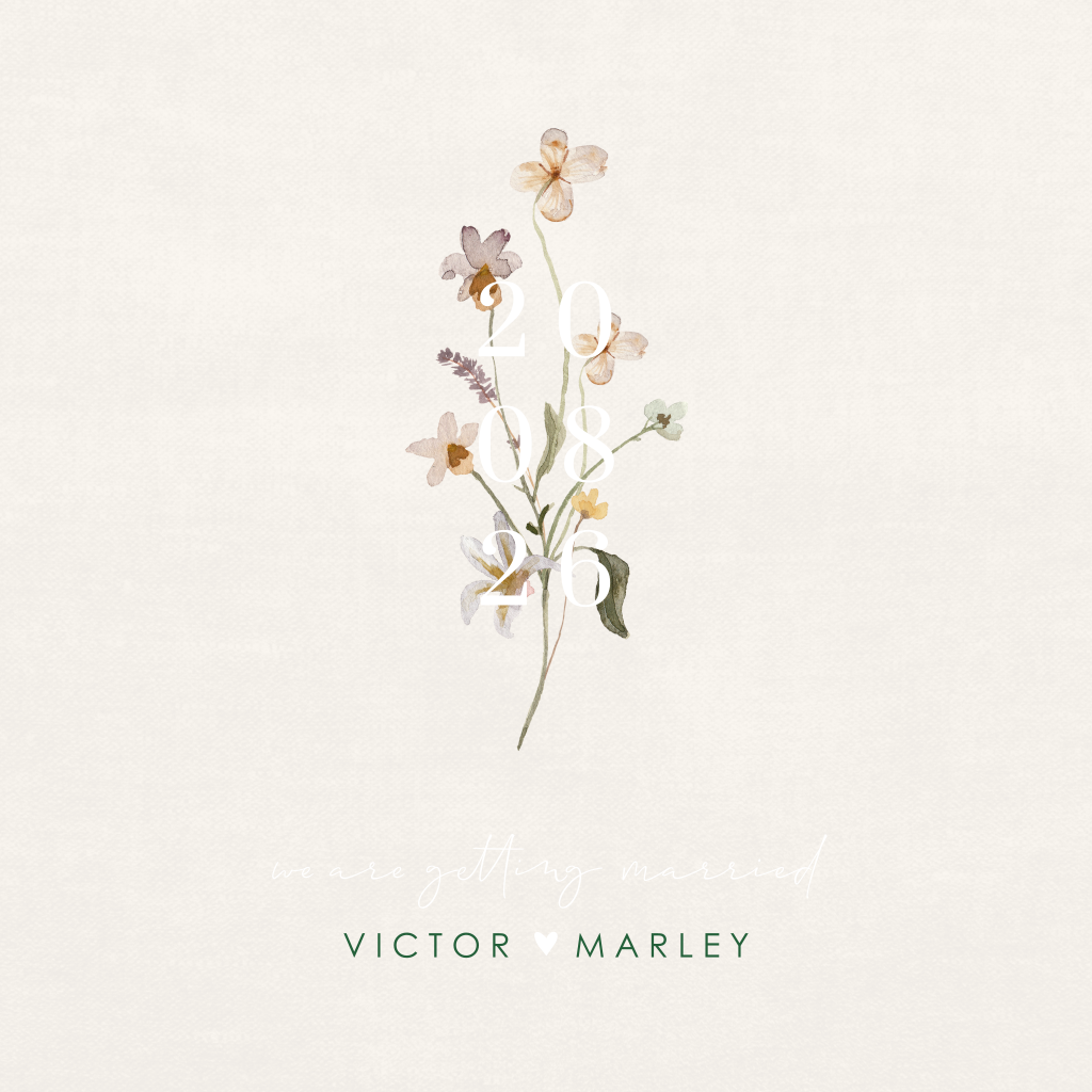 Romantische trouwkaart met prachtige aquarel bloemen met jullie trouwdatum in glanzend goudfolie. De foliedruk geeft deze trouwuitnodiging een luxe, exclusieve uitstraling! De kleur van de foliebedrukking en de teksten kun je in de ontwerpmodule aanpassen. Vragen? Laat het ons weten!