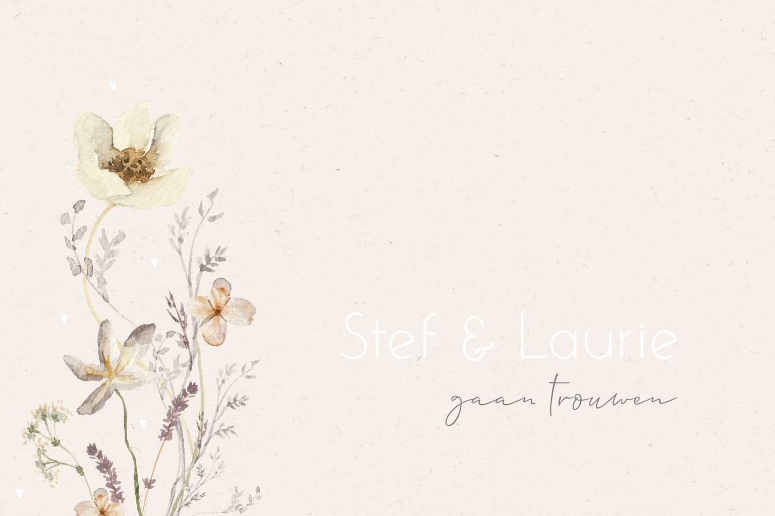 Klassieke trouwkaart met aquarel bloemen en een kartonlook achtergrond. Jullie namen en de kleine hartjes worden gedrukt in écht goudfolie. De folie heeft een mooie glans en geeft deze kaart een extra luxe uitstraling.
