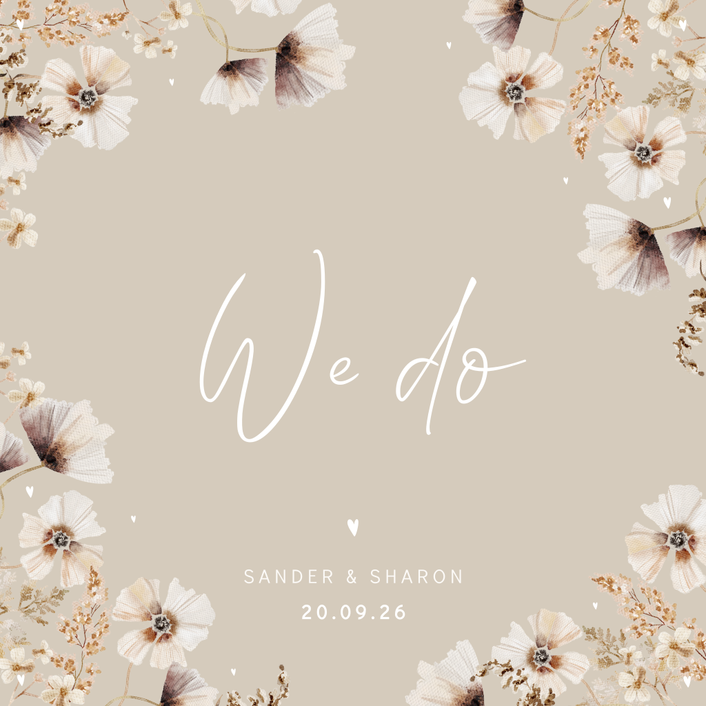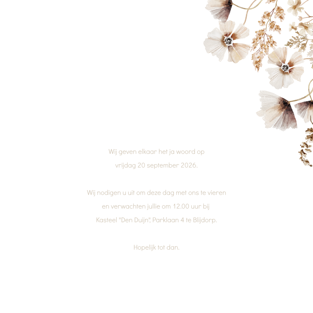 Zeggen jullie 'Ja' tegen elkaar? Ga dan voor deze prachtige trouwkaart met bloemen en foliedruk. De rustige beige en bruine bloemen in combinatie met de glanzende goudfolie geven deze kaart een klassieke en luxe uitstraling. Pas de kaart naar eigen wens aan in de editor. Hulp nodig? Bel, mail of chat ons gerust!