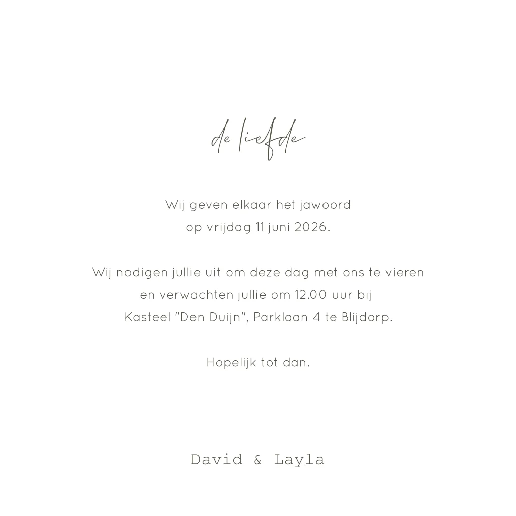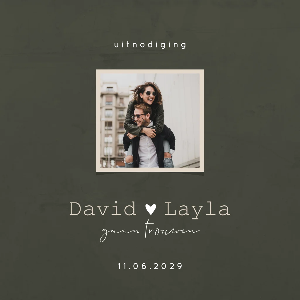 Een basic huwelijksuitnodiging met een betonlook achtergrond in een trendy groene kleur. Deze trouwkaart bevat écht foliedruk. De toevoeging van roséfolie maakt deze kaart helemaal af. Voeg jullie persoonlijke foto toe en maak het kaartje compleet! Teksten en kleuren van deze hippe trouwkaart zijn makkelijk aan te passen in onze editor.