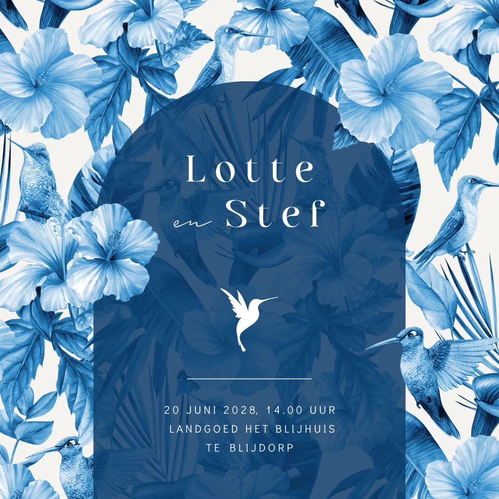 Op zoek naar een prachtige trouwkaart met een vleugje luxe? Ontdek deze trouwkaart met foliedruk in Delfts blauwe kleuren, voorzien van een stijlvol ontwerp met bloemen en kolibrie vogels. In het blauwe arch vorm kader staan de namen van het bruidspaar en de kolibrie in roségouden foliedruk. Dat geeft deze trouwkaart een extra luxe uitstraling!