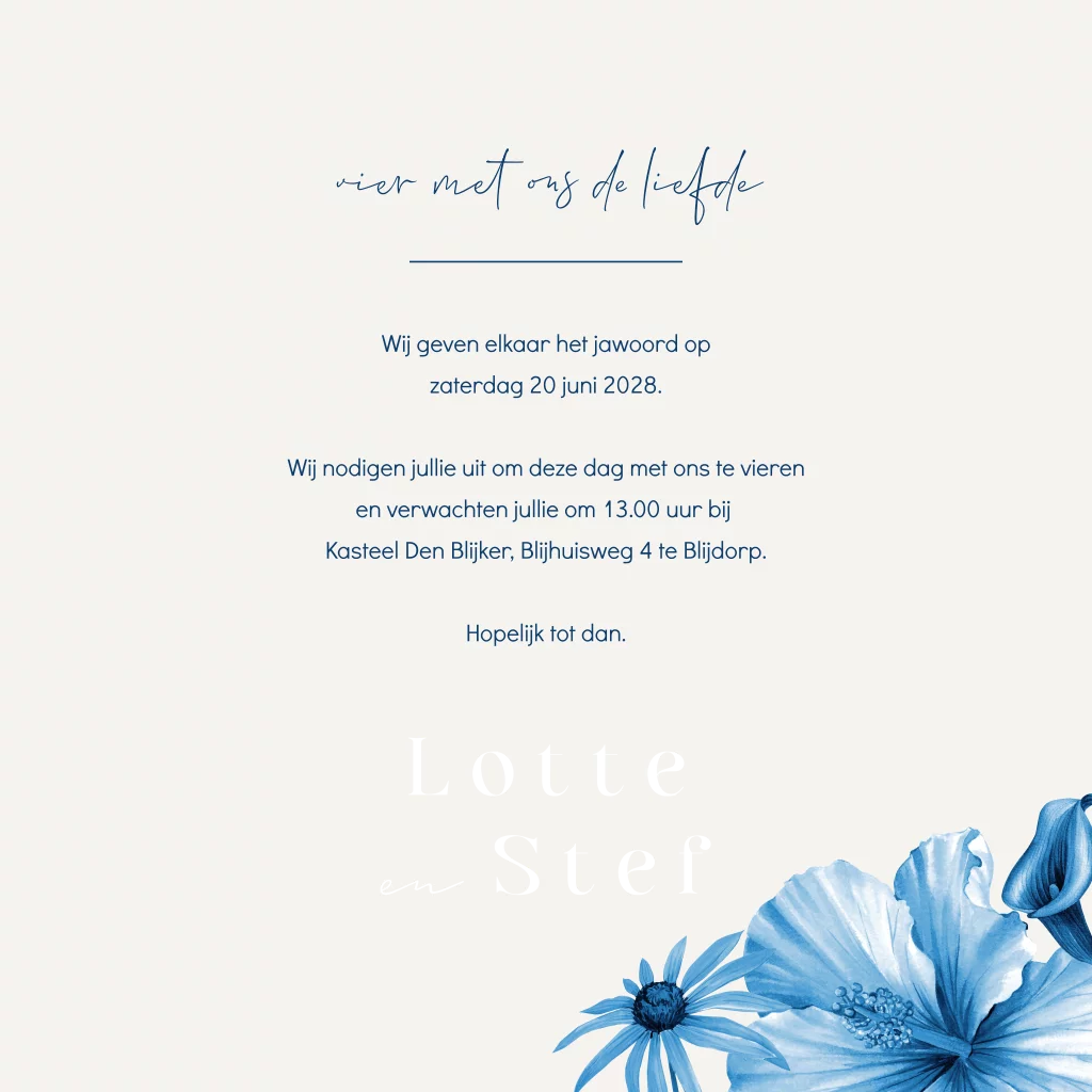 Deze trouwkaart straalt tijdloze elegantie uit en is perfect voor stellen die een klassieke en toch eigentijdse uitnodiging willen versturen. Maak de kaart helemaal af met een bijpassende blauwe envelop en sluitzegel.