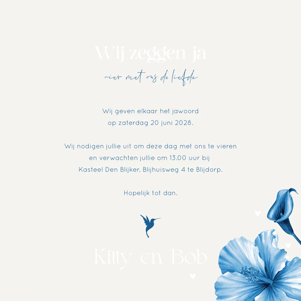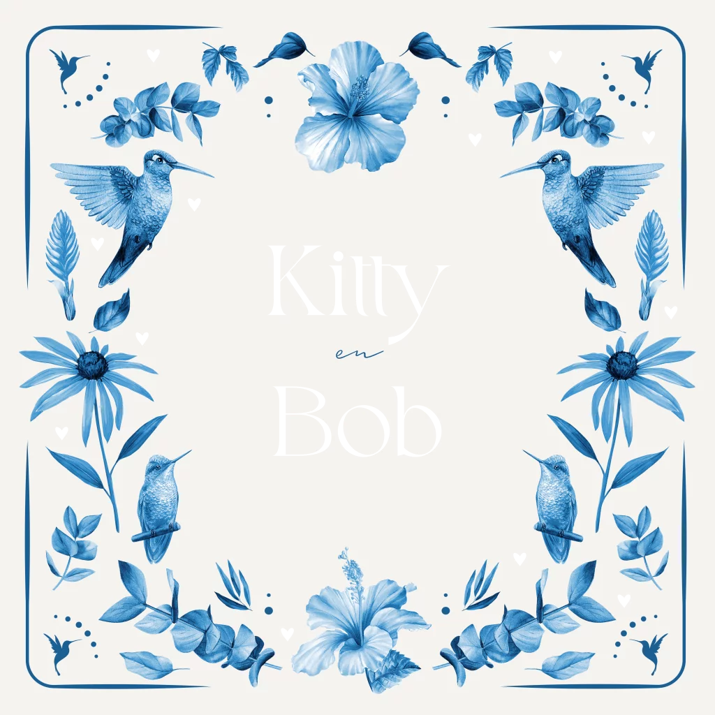 Een Delfts blauwe trouwkaart met schattige kolibries, bloemen en kleine hartjes. Deze trouwkaart heeft een speels kader en is voorzien van goudfolie. Foliedruk geeft de trouwkaart een extra vleugje luxe! Pas de kaart naar eigen wens aan in de online editor en kies voor een bijpassende sluitzegel om de trouwkaart in stijl af te maken.