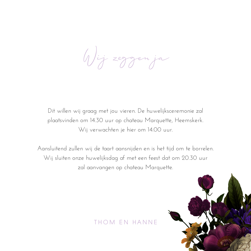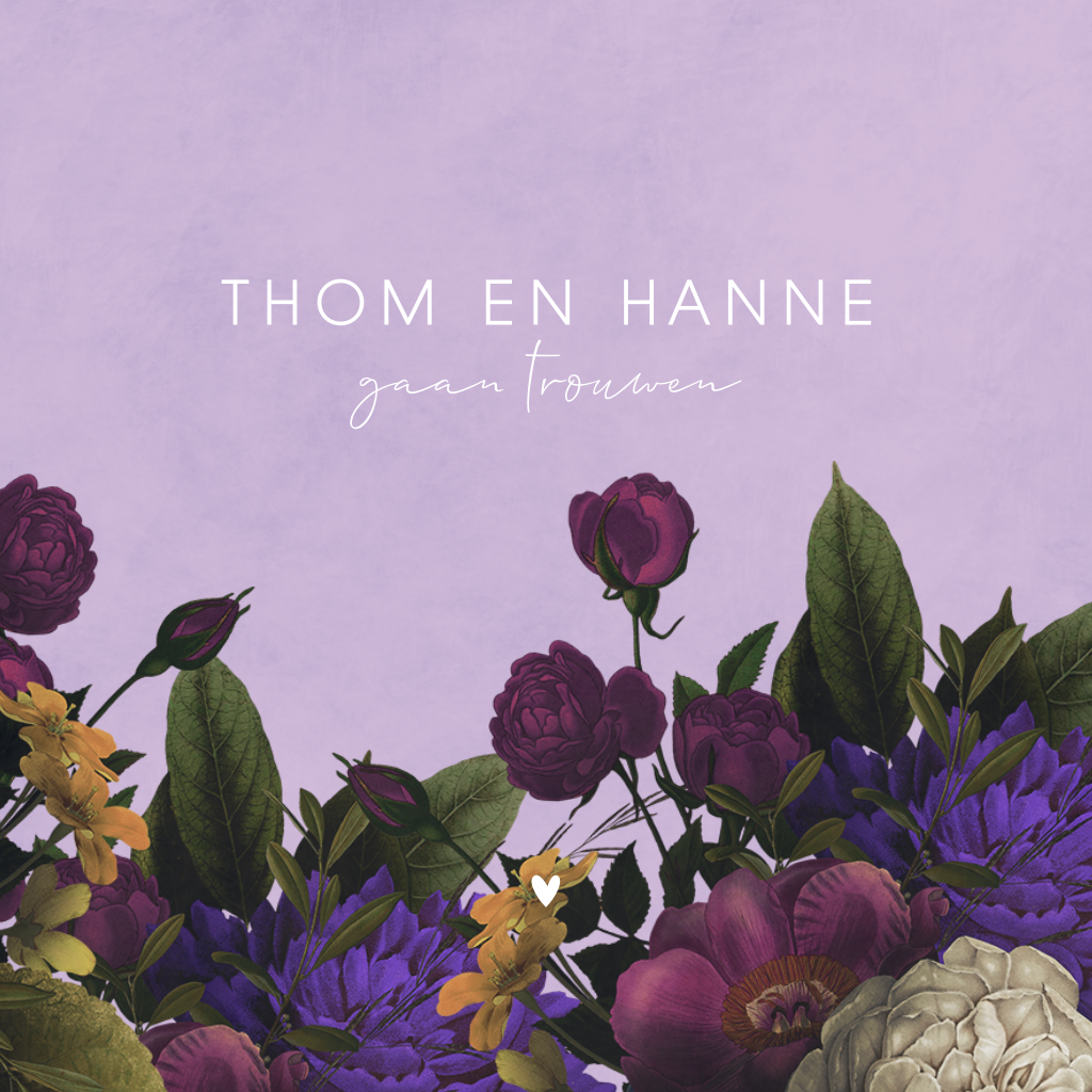 Kleurrijke trouwkaart met prachtige handgeschilderde bloemen. Op deze huwelijksuitnodiging elementen in goudfolie. Dat maakt het kaartje nog exclusiever! De kleur van de foliedruk pas je eenvoudig aan in de ontwerpmodule. Vragen? We helpen je graag!