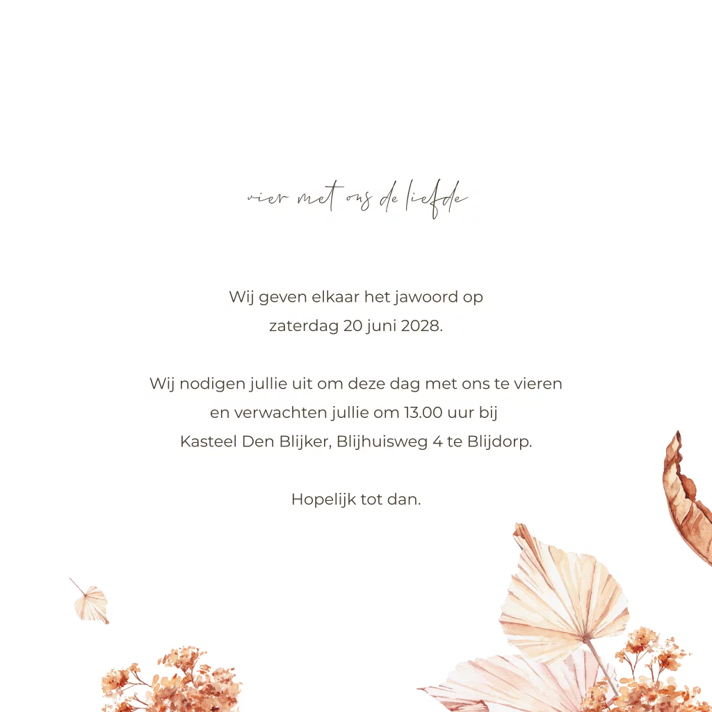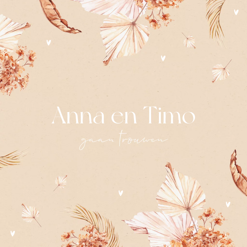 Romantische trouwkaart met droogbloemen in zachte roze/beige kleuren. De hartjes worden gedrukt in écht goudfolie wat een luxe touch geeft aan deze bloemen uitnodiging. Pas de kaart geheel naar eigen wens aan in de editor, zodat jullie trouwkaart precies aan jullie wensen voldoet. Heb je vragen? Laat het ons dan gerust weten, we helpen je graag verder!