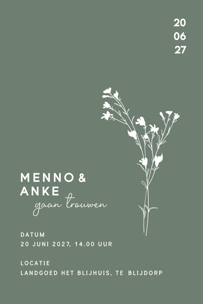 Wanneer je kiest voor een minimalistische trouwkaart met bloemen, kies je voor een eenvoudige en stijlvolle kaart. Deze kaart is bedrukt met goudfolie en heeft ronde hoeken, dit geeft een luxe uitstraling aan de trouwkaart. De bloemen worden gedrukt in goudfolie en de achtergrond is trendy groen. Deze kaart is geschikt voor elk seizoen. Pas de kleuren, teksten en lettertypen eenvoudig aan in de editor. Hulp nodig? Wij helpen je graag!