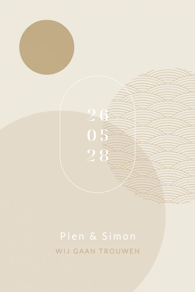 Rustige en stijlvolle trouwkaart met organische vormen en beige tinten, helemaal volgens de nieuwste Japandi trend! De afgeronde hoeken en dubbelzijdige foliedruk geven een luxe touch aan deze huwelijksuitnodiging. Je kunt deze kaart eenvoudig aanpassen naar jouw eigen wensen. Hulp nodig? Wij helpen je graag! Bel, mail of chat ons gerust.